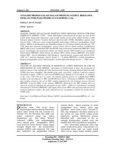 Susiantini, Endang and Setyadji, Mochamad (2005) ANALISIS PROSES GELASI DALAM MEDIUM 2-ETHYL HEKSANOL DENGAN FTIR PADA PEMBUATAN KERNEL U3O8. In: PPI - PDIPTN 2005 Puslitbang Teknologi Maju, 2 Juli 2005, Yogyakarta.