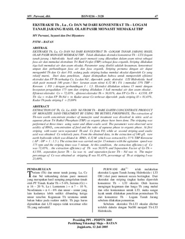 EKSTRAKSI Th, La, Ce DAN Nd DARI KONSENTRAT Th –LOGAM TANAH JARANG HASIL OLAH PASIR MONASIT MEMAKAI TBP. Telah dilakukan ekstraksi konsentrat Th – LTJ (logam tanah jarang ) hidroksida hasil olah pasir monasit yang dilarutkan dalam asam nitrat sebagai fasa air dan memakai ekstraktan Tri Butil Fosfat (TBP) sebagai fasa organik. Striping dilakukan tiga kali memakai air dan asam oksalat. Parameter yang diteliti adalah keasaman, konsentrasi umpan dan perbandingan fasa air dan fasa organik. Striping pertama dengan air dapat mengambil Th dan Ce dari FO, sedang pada striping kedua memkai oksalat diperoleh Ce yang relatif murni. Dari data penelitian, dapat disimpulkan bahwa untuk memperoleh efisiensi ekstraksi dan FP Th terhadap Ce, La dan Nd , diperoleh pada ekstraksi LTJ Hidroksida hasil olah pasir monasit 140 gram / liter larutan asam nitrat 4,32 M ( FA ) memakai 15% TBP – Kerosen ( FO ) dengan perbandingan I : 1,5. Ekstraksi dilakukan selama 15 menit dengan kecepatan pengadukan 175 rpm dan striping dilakukan 3 kali memakai air dan asam oksalat . Efisiensi ekstraksi Ce = 72,05% , efisiensi ekstraksi Th = 50,81%, dan FP Ce-Th = 4,1558, FP Th –La = ∞ dan FP Th-Nd = ∞. Kadar unsur Ce terbesar diperoleh pada striping II = 81,43%, Kadar Th pada striping I = 25,69%