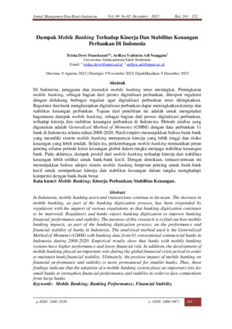 Triska, Dewi Pramitasari and Ardhya, Yudistira Adi Nanggala (2023) Dampak mobile banking terhadap kinerja dan stabilitas keuangan perbankan di Indonesia. Jurnal Manajemen Dan Bisnis Indonesia, 9 (2): 5. pp. 241-252. ISSN 2460-9471