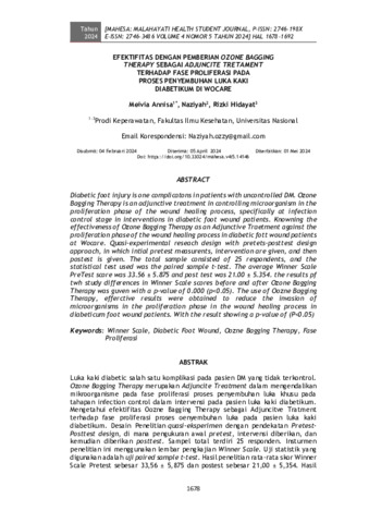 Meivia, Annisa and Naziyah, Naziyah and Rizki, Hidayat (2024) Efektifitas dengan pemberian ozone bagging therapy sebagai adjuncite treatment terhadap fase proliferasi pada proses penyembuhan luka kaki diabetikum di Wocare. MAHESA : Malahayati Health Student Journal, 4 (5): 3. pp. 1678-1692. ISSN 2746-198X