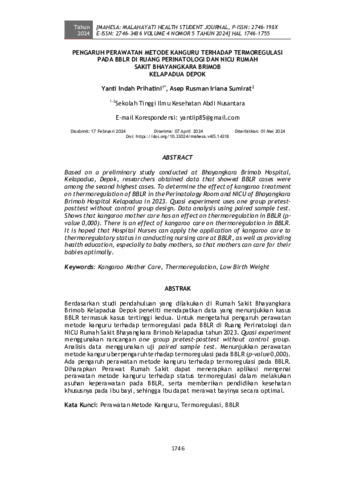 Yanti, Indah Prihatini and Asep, Rusman Iriana Sumirat (2024) Pengaruh perawatan metode kanguru terhadap termoregulasi pada BBLR di Ruang Perinatologi dan Nicu Rumah Sakit Bhayangkara Brimob Kelapadua Depok. MAHESA : Malahayati Health Student Journal, 4 (5): 9. pp. 1746-1755. ISSN 2746-198X