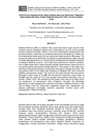 Riyan, Mulfianda and Alvi, Keumala and Saiful, Riza (2024) Efektivitas pemanfaatan video edukasi melalui whatsaap terhadap manajemen diri pada pasien diabetes mellitus tipe 2 di Kota Banda Aceh. MAHESA : Malahayati Health Student Journal, 4 (5): 12. pp. 1777-1784. ISSN 2746-198X