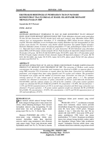 EKSTRAKSI BERTINGKAT PEMISAHAN Th DAN Nd DARI KONSENTRAT Th-LTJ OKSALAT HASIL OLAH PASIR MONASIT MENGGUNAKAN TBP. Telah dilakukan ekstraksi untuk pemisahan Th dan Nd dari konsentrat Th-LTJ oksalat hasil olah pasir monasit yang dilarutkan dalam HNO3 sebagai fasa air menggunakan ekstraktan 15 % tributilfosfat (TBP) dalam kerosen sebagai fasa organik. Ekstraksi dilakukan secara bertingkat dan striping dilakukan tiga kali menggunakan air dan larutan asam oksalat 5%. Parameter yang diteliti adalah keasaman dan jumlah tingkat ekstraksi. Ekstraksi dilakukan selama 15 menit, kecepatan pengadukan 175 rpm, perbandingan volume FA:FO = 1:1. Diperoleh hasil terbaik pada ekstraksi 25 gram konsentrat Th-LTJ hidroksid yang dilarutkan dalam HNO3 8,64 M sampai volume menjadi 250 ml. Pada keadaan ini diperoleh endapan konsentrat Th oksalat 2,28 gram, Kd Th 0,59, Kd Nd 0,0079, kadar Th 81,89%, kadar Nd 1,12% dan faktor pisah Th-Nd 254 pada tingkat ekstraksi II dan ekstraksi tingkat III diperoleh endapan 1,79 gram, Kd Th 0.69, Kd Nd 0,002, dan kadar Th 87,85%, kadar Nd 0,22%, faktor pisah Th-Nd 345 dan efisiensi ekstraksi total Th 87.07 %.