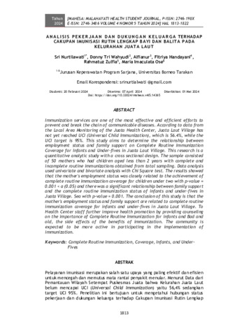 Sri, Nurtilawati and Donny, Tri Wahyudi and Alfianur, Alfianur and Fitriya, Handayani and Rahmatuz, Zulfia and Maria, Imaculata Ose (2024) Analisis pekerjaan dan dukungan keluarga terhadap cakupan imunisasi rutin lengkap bayi dan balita pada Kelurahan Juata Laut. MAHESA : Malahayati Health Student Journal, 4 (5): 15. pp. 1813-1822. ISSN 2746-198X