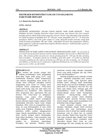 EKSTRAKSI KONSENTRAT LOGAM TANAH JARANG DARI PASIR MONASIT. Telah dilakukan ekstraksi terhadap konsentrat logam tanah jarang yang berasal dari pasir monasit memakai pelarut tributil fosfat dalam pengencer kerosin. Variasi yang dikenakan pada penelitian ini adalah kecepatan pengadukan dari 50 –250 rpm, waktu pengadukan dari 10 – 35 menit dan pemakaian Al(NO3)3 dari 0,05 gr/ml sampai 0,7 gr/ml, diperoleh kondisi ekstraksi relatif baik untuk kecepatan pengadukan 100 rpm, waktu pengadukan 30 menit dan penggunaan Al(NO3)3 dalam umpan 0,1 gr/ml dan memberikan koefisien distribusi (Kd) La= 0,208 dan faktor pisah La-Ce 11,954 ; La-Nd 18,910.