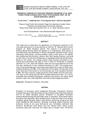 Penelitian ini bertujuan untuk mengetahui Penerapan Therapeutic Positions Terhadap Parameter Vital Signs Pasien Stroke di Rumah Sakit Pusat Otak Nasional Prof Dr. dr. Mahar Mardjono Jakarta. Penelitian ini merupakan Penerapan Evidence-Based Nursing yang diterapkan pada 12 responden. Setiap pasien dalam kelompok studi diposisikan pada berbagai posisi terapeutik setiap 2 jam dengan mengikuti jadwal berputar seperti semi fowler's, berbaring miring ke sisi yang sehat (Unaffected Side Position), berbaring terlentang (Supine Position) dan berbaring miring ke sisi yang hemiparesis atau hemiplegia (Affected Side Position). Berdasarkan hasil bahwa rata-rata tekanan darah sistole terjadi penurunan pada post intervensi hari kedua (day 2) dengan mean 124.08 dan standar deviasi 3.147, sedangkan diastole diperoleh mean yang tidak berbeda jauh dengan hari pertama yaitu 83.17 dan standar deviasi 2.657. Rata-rata heart rate post intervensi hari kedua terjadi penurunan dengan mean 84.92 dan standar deviasi 0.900. Pada variabel respiration rate diperoleh penurunan untuk nilai mean post intervensi hari kedua adalah 15.33 (standar deviasi 0.888). Nilai mean pada kadar saturasi oksigen (SPO2) dengan nilai mean post-test hari kedua 99.75 (standar deviasi 0.452). Pemberian intervensi therapeutic positions dapat menurunkan tekanan darah, heart rate, respiration rate dan meningkatkan saturasi oksigen.