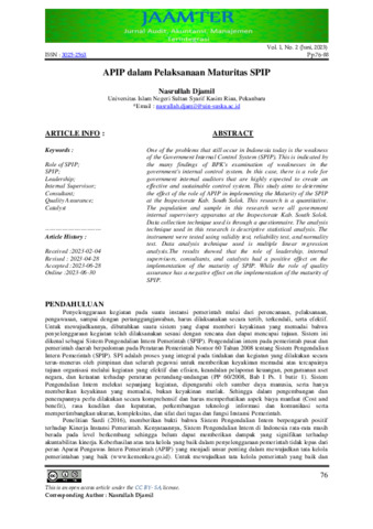 Nasrullah, Djamil (2023) APIP dalam pelaksanaan maturitas SPIP. Jurnal Audit, Akuntansi, Manajemen Terintegrasi, 1 (2): 1. pp. 76-88. ISSN 3025-2563