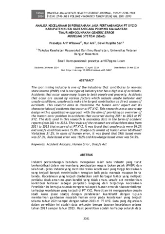 Prasetya, Arif Wibawa and Nur, Ani and Dewi, Puspito Sari (2024) Analisa kecelakaan di perusahaan jasa pertambangan PT XYZ di Kabupaten Kutai Kartanegara Provinsi Kalimantan Timur menggunakan Generic Error Modeling System (GEMS). MAHESA : Malahayati Health Student Journal, 4 (5): 35. pp. 2081-2093. ISSN 2746-198X