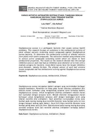 Lulu, Nabil and Ally, Kafesa (2024) Variasi aktivitas antibakteri ekstrak etanol tumbuhan dengan kandungan senyawa tanin terhadap bakteri Staphylococcus aureus. MAHESA : Malahayati Health Student Journal, 4 (5): 36. 2094-2108k. ISSN 2746-198X