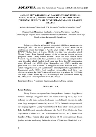 Yohanes, Krismasno and Barnabas, P.P.W Bhokaleba and Maria, Imaculata Rume (2024) Analisis biaya, penerimaan dan keuntungan budidaya udang vaname (Litopenaeus vannamei) skala intensif di Balai Perikanan Budidaya Air Payau (BPAP) Takalar, Sulawesi Selatan. Aquanipa : Jurnal Ilmu Kelautan dan Perikanan, 6 (1): 2. pp. 9-15. ISSN 2723-0031