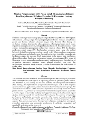 Moh., Kurdil and Fatmawati, Fatmawati and Purwanti, Ratna Wahyuni and Moh., Anwar and Ribut, Sentosa (2023) Strategi pengembangan SDM petani untuk meningkatkan efisiensi dan kesejahteraan di sektor pertanian di Kecamatan Lenteng Kabupaten Sumenep. Jurnal Manajemen Dan Bisnis Indonesia, 9 (2): 10. pp. 308-315. ISSN 2460-9471