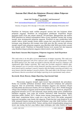 Ahmad, Alief Wardiman and Syafrifuddin, Syarifuddin and Andi, Kusumawati (2023) Suasana hati (mood) dan kejujuran (honesty) dalam pelaporan anggaran. Jurnal Manajemen Dan Bisnis Indonesia, 9 (2): 15. pp. 362-372. ISSN 2460-9471