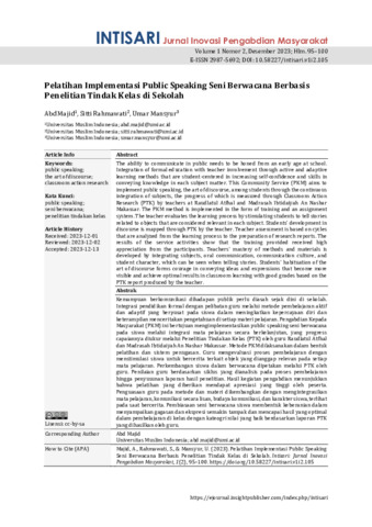 Abd, Majid and Sitti, Rahmawati and Ummar, Mansyur (2023) Pelatihan implementasi public speaking seni berwacana berbasis penelitian tindak kelas di sekolah. Intisari: Jurnal Inovasi Pengabdian Masyarakat, 1 (2): 7. pp. 95-100. ISSN 2987-5692