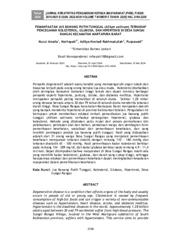 Nurul, Amalia and Norhayati, Norhayati and Aditya, Noviadi Rakhmatullah and Puspawati, Puspawati (2024) Pemanfaatan jus bawang putih tunggal (Allium sativum) terhadap pencegahan kolesterol, glukosa, dan hipertensi di Desa Sungai Rangas Kecamatan Martapura Barat. Jurnal Kreativitas Pengabdian kepada Masyarakat, 7 (5): 28. pp. 2194-2208. ISSN 2615-0921