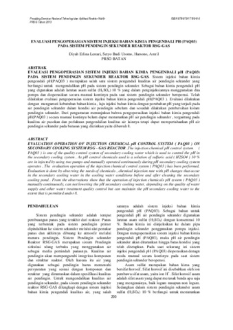 EVALUASI PENGOPERASIAN SISTEM INJEKSI BAHAN KIMIA PENGENDALI pH (PAQ03) PADA SISTEM PENDINGIN SEKUNDER REAKTOR RSG-GAS. Sistem injeksi bahan kimia pengendali pH(PAQ03 ) merupakan salah satu sistem pengendali kualitas air pendingin sekunder yang berfungsi untuk mengendalikan pH pada sistem pendingin sekunder. Sebagai bahan kimia pengendali pH yang digunakan adalah larutan asam sulfat (H2SO4) 10 % yang dalam penginjeksiannya menggunakan dua pompa dan dioperasikan secara manual kontinyu pada saat sistem pendingin sekunder beroperasi. Telah dilakukan evaluasi pengoperasian sistem injeksi bahan kimia pengendali pH(PAQ03 ). Evaluasi dilakukan dengan mengamati kebutuhan bahan kimia , laju injeksi bahan kimia dengan perubahan pH yang terjadi pada air pendingin sekunder dalam kondisi air pendingin sebelum dan sesudah dilakukan pembersihan kolam pendingin sekunder. Dari pengamatan menunjukan bahwa pengoperasikan injeksi bahan kimia pengendali pH(PAQ03 ) secara manual kontinyu belum dapat menurunkan pH air pendingin sekunder , tergantung pada kualitas air pasokan dan perlakuan pengendalian kualitas air lainnya tetapi dapat mempertahankan pH air pendingin sekunder pada batasan yang diizinkan yaitu dibawah 8.