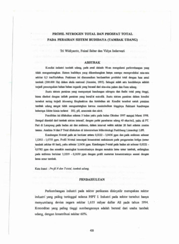 Kondisi industri tambak udang, pada awal dekade 90-an mengalami perkembangan yang tidak menguntungkan. Sistem budidaya yang dikembangkan hanya mampu memproduksi rata-rata sekitar 0,5 ton/Ha/tahun. Prakiraan inidiasumsikan berdasarkan produksi total dengan luas arealtambak (200.000 Ha) dalam skala nasional (Anonim, 1995). Sebagai salah satu kendalanya adalah terjadi penumpukan bahan bahan organik yang berasal dari sisa-sisa pakan dan feces udang.Suatu sistem perairan yang mempunyai kandungan nitrogen dan fosfat total yang tinggi, biasa disebut dengan istilah perairan yang bersifat eutrofik. Suatu sistem perairan dalam kondisi tersebut sering terjadi blooming fitoplankton dan tumbuhan air. Kondisi tersebut untuk perairan tambak udang sangat tidak menguntungkan karena menimbulkan tingginya fluktuasi kandungan beberapa faktor kimia terlarut DO, pH, ammonia dan nitrit.Penelitian inidilakukan selama 5bulan yaitu pada bulan Oktober 1997 sampai Maret 1998.Sampel diambil dari tambak sistem intensif, dengan padat penebaran udang 45 ekor/m2, yaitu di PT.Pari di Lampung pada badan air dan sedimen, dalam interval waktu sekitar 20 hari selarna musim tanam. Analisis N dan P Total dilakukan di laboratorium Mikrobiologi Puslitbang Limnologi LIP!.Kandungan N-total pada air berkisar antara 0,0122 - 3,0436 ppm dan pada sedimen sebesar 1,1202 - 1,6733 ppm. Profil N-total mencapai konsentrasi maksimum pada pengamatan ketiga (umur tambak sekitar 60 hari), yaitu sebesar 3,0436 ppm. Kandungan P-total pada badan air sebesar 0,0222 0,0782 ppm dan semakin meningkat konsentrasinya dengan semakin lama umur tambak, sedangkan pada sedimen berkisar 3,2219 - 0,1650 ppm dengan profil menurun konsentrasinya sesuai dengan lama umur tambak.