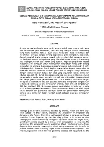 Rizky, Fitri Andini and Ikha, Prastiwi and Dewi, Agustin (2024) Edukasi pemenuhan gizi seimbang melalui perbaikan pola makan pada remaja putri dalam upaya pencegahan anemia. Jurnal Kreativitas Pengabdian kepada Masyarakat, 7 (5): 33. pp. 2250-2258. ISSN 2615-0921