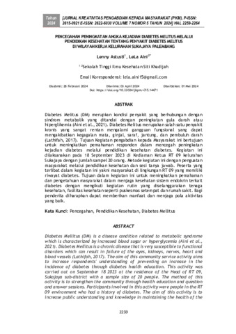 Lenny, Astusti and LeLa, Aini (2024) Pencegahan peningkatan angka kejadian diabetes melitus melalui pendidikan kesehatan tentang penyakit diabetes melitus di Wilayah Kerja Kelurahan Sukajaya Palembang. Jurnal Kreativitas Pengabdian kepada Masyarakat, 7 (5): 34. pp. 2259-2264. ISSN 2615-0921