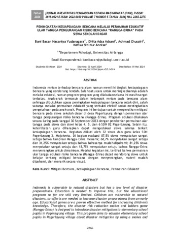 Bani, Bacan Hacantya Yudanagara and Dhita, Adsa Adsani and Achmad, Chusairi and Nafika, Siti Nur Annisa (2024) Peningkatan kesiapsiagaan bencana melalui permainan edukatif ular tangga pengurangan risiko bencana “Rangga-Erina” pada siswa sekolah dasar. Jurnal Kreativitas Pengabdian kepada Masyarakat, 7 (5): 35. pp. 2265-2275. ISSN 2615-0921