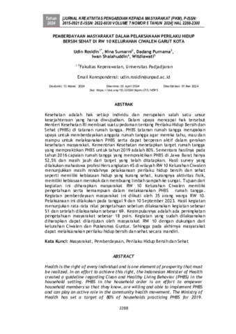Udin, Rosidin and Nina, Sumarni and Dadang, Purnama and Iwan, Shalahuddin and Witdiawati, Witdiawati (2024) Pemberdayaan masyarakat dalam pelaksanaan perilaku hidup bersih sehat di RW 10 Kelurahan Ciwalen Garut Kota. Jurnal Kreativitas Pengabdian kepada Masyarakat, 7 (5): 37. pp. 2288-2300. ISSN 2615-0921