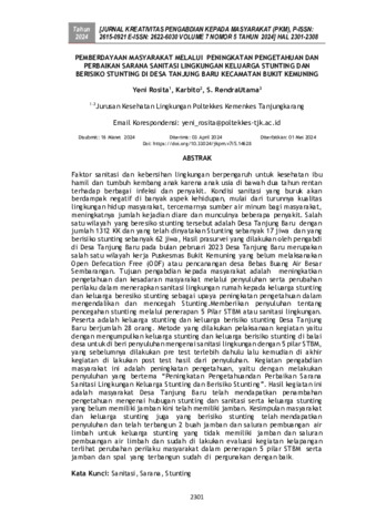 Yeni, Rosita and Karbito, Karbito and Rendra, Utama (2024) Pemberdayaan masyarakat melalui peningkatan pengetahuan dan perbaikan sarana sanitasi lingkungan keluarga stunting dan berisiko stunting di Desa Tanjung Baru Kecamatan Bukit Kemuning. Jurnal Kreativitas Pengabdian kepada Masyarakat, 7 (5): 38. pp. 2301-2308. ISSN 2615-0921