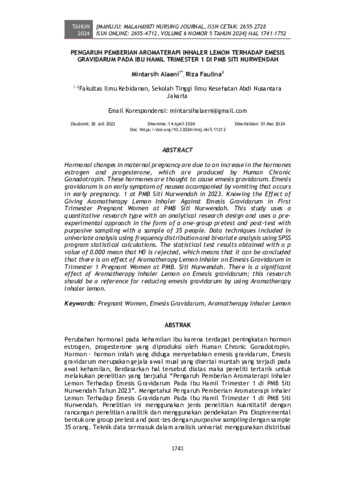 Mintarsih, Alaeni and Riza, Faulina (2024) Pengaruh pemberian aromaterapi inhaler lemon terhadap emesis gravidarum pada ibu hamil trimester 1 di PMB Siti Nurwendah. Manuju : Malahayati Nursing Journal, 6 (5): 1. pp. 1741-1752. ISSN 2655-2728