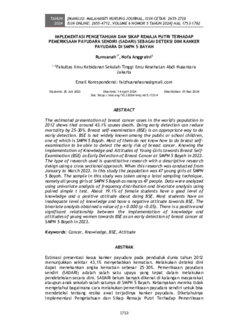 Rumsanah, Rumsanah and Nofa, Anggraini (2024) Implementasi pengetahuan dan sikap remaja putri terhadap pemeriksaan payudara sendiri (sadari) sebagai deteksi dini kanker payudara di SMPN 5 Bayah. Manuju : Malahayati Nursing Journal, 6 (5): 2. pp. 1753-1762. ISSN 2655-2728