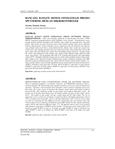 Taxwim, Taxwim and Yunanto, yunanto and Sayono, Sayono (2005) RANCANG BANGUN SISTEM OTOMATISASI PROSES SPUTTERING DENGAN MIKROKONTROLER. Prosiding Pertemuan dan Presentasi Ilmiah Teknologi Akselerator dan Aplikasinya, 7. pp. 49-58. ISSN 1411-1349