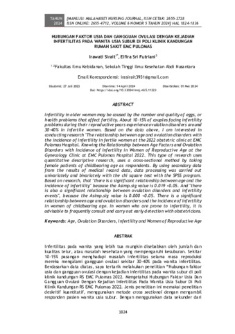 Irawati, Sirait and Elfira, Sri Futriani (2024) Hubungan faktor usia dan gangguan ovulasi dengan kejadian infertilitas pada wanita usia subur di Poli Klinik Kandungan Rumah Sakit EMC Pulomas. Manuju : Malahayati Nursing Journal, 6 (5): 8. pp. 18120-1836. ISSN 2655-2728