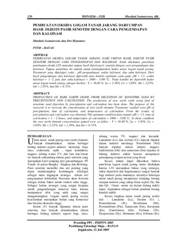 Soemarsono, Murdani and Biyantoro, Dwi (2005) PEMBUATAN OKSIDA LOGAM TANAH JARANG DARI UMPAN HASIL DIJESTI PASIR SENOTIM DENGAN CARA PENGENDAPAN DAN KALSINASI. Prosiding PPI – PDIPTN 2005 Puslitbang Teknologi Maju. pp. 120-126. ISSN 0216 – 3128