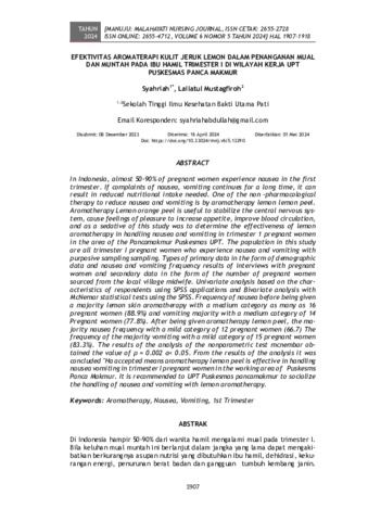 Syahriah, Syahriah and Lailatul, Mustagfiroh (2024) Efektivitas aromaterapi kulit jeruk lemon dalam penanganan mual dan muntah pada ibu hamil trimester I di Wilayah Kerja UPT Puskesmas Panca Makmur. Manuju : Malahayati Nursing Journal, 6 (5): 14. pp. 1907-1918. ISSN 2655-2728