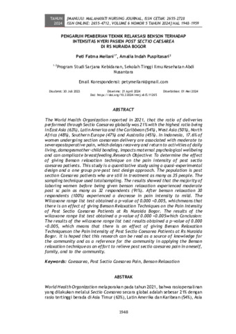 Peti, Fatma Meilani and Amalia, Indah Puspitasari (2024) Pengaruh pemberian teknik relaksasi benson terhadap intensitas nyeri pasien post sectio caesarea di RS Nuraida Bogor. Manuju : Malahayati Nursing Journal, 6 (5): 18. pp. 1949-1959. ISSN 2655-2728