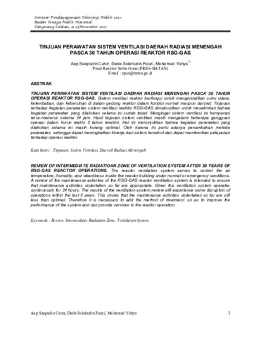 Aep Saepudin Catur, ASC and Solehudin, Dede and Yahya, Mohamad (2017) TINJUAN PERAWATAN SISTEM VENTILASI DAERAH RADIASI MENENGAH PASCA 30 TAHUN OPERASI REAKTOR RSG-GAS. SEMINAR PENDAYAGUNAAN TEKNOLOGI NUKLIR. ISSN 2540-8062
