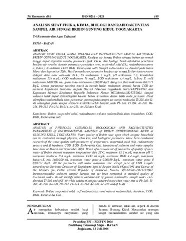 Rusmanto, Tri and Taftazani, Agus (2005) ANALISIS SIFAT FISIKA, KIMIA, BIOLOGI DAN RADIOAKTIVITAS SAMPEL AIR SUNGAI BRIBIN GUNUNG KIDUL YOGYAKARTA. Prosiding PPI – PDIPTN 2005 Puslitbang Teknologi Maju. pp. 189-196. ISSN 0216 – 3128