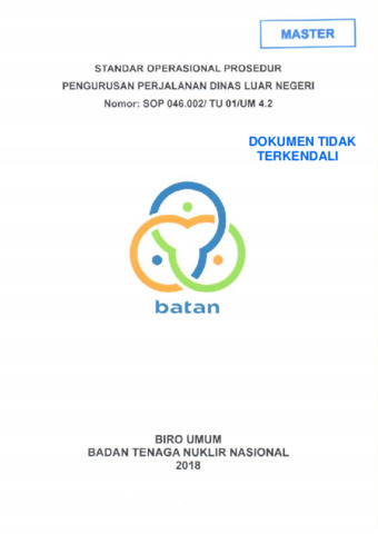 Standar Operasional Prosedur (SOP) ini dibuat untuk mengatur kegiatan pengurusan ijin, exit permit, passport, visa dan pemesanan tiket dan asuransi perjalanan dinas luar negeri bagi pegawai di lingkungan BATAN