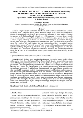 Rofi Surya, Aryanto (2020) Minyak Atsiri Kulit Kayu Manis (Cinnamomun Burmanni) sebagai Penghambat Pertumbuhan Lumut pada Candi Kedaton. Siddhayatra: Jurnal Arkeologi, 25 (1): 4. pp. 47-58. ISSN 0853-9030