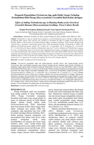 I, Kadek Wira Pradana and Rindang, Dwiyani and Gusti, Ngurah Alit Susanta Wirya (2024) Pengaruh penambahan Trichoderma Spp. pada media tanam terhadap pertumbuhan bibit pisang (Musa acuminata) cavendish hasil kultur jaringan. Agro Bali : Agricultural Journal, 7 (1): 19. pp. 205-211. ISSN 2655-853X