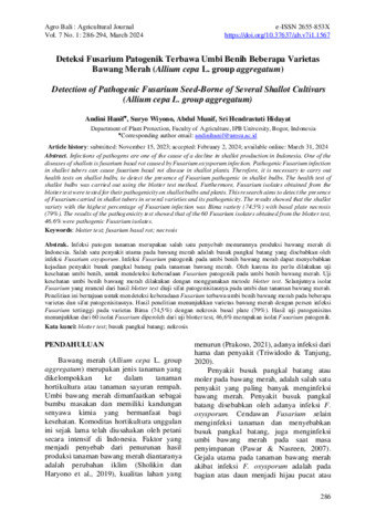 Andini, Hanif and Suryo, Wiyono and Abdul, Munif and Sri, Hendrastuti Hidayat (2024) Deteksi fusarium patogenik terbawa umbi benih beberapa varietas bawang merah (Allium cepa L. group aggregatum). Agro Bali : Agricultural Journal, 7 (1): 27. pp. 286-294. ISSN 2655-853X