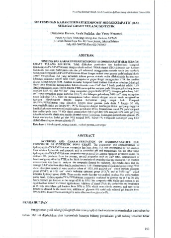Telah dilakukan pembuatan dan karakterisasi komposit hidroksiapatit/PVA/PVPkhitosan dengan teknik radiasi. Hidroksiapatit (HA) disintesis dari kalsium hidroksida dan asam fosfat pada suhu dan pH terkontrol menggunakan metode basah (wet method).