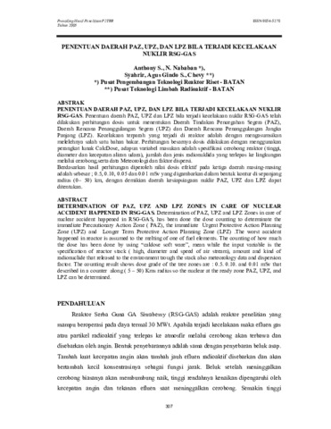 Anthony Simanjuntak, AS and Nababan, Naek (2005) PENENTUAN DAERAH PAZ, UPZ, DAN LPZ BILA TERJADI KECELAKAAN NUKLIR RSG-GAS. PROSIDING SEMINAR HASIL PENELITIAN PTRR. ISSN 0854-5278