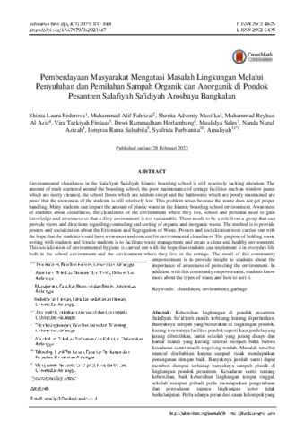 Shinta, Laura Federova and Muhammad, Alif Fahrizal and Sherita, Adventy Mustika and Muhammad, Reyhan Al Aziz and Vira, Tazkiyah Firdaus and Dewi, Rammadhani Herlambang and Maulidya, Sales and Nanda, Nurul Azizah and Ismyrza, Ratna Salsabila and Syafrida, Purbianita and Amaliyah, Amaliyah (2023) Pemberdayaan masyarakat mengatasi masalah lingkungan melalui penyuluhan dan pemilahan sampah organik dan anorganik di pondok pesantren Salafiyah Sa'idiyah Arosbaya Bangkalan. Indonesia Berdaya, 4 (3): 6. pp. 837-848. ISSN 2721-0669