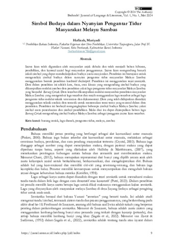 Hafizah, Hafizah and Mariyadi, Mariyadi (2024) Simbol budaya dalam nyanyian pengantar tidur masyarakat Melayu Sambas. Bedande’: Journal of Language & Literature, 1 (1): 2. pp. 9-14. ISSN 3048-1600