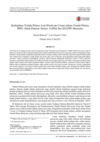 Hariadi, Rahman and Lalu, Parman and Ufran, Ufran (2023) Kedudukan tindak pidana asal (predicate crime) dalam tindak pidana TPPU (studi putusan nomor 516/Pid.Sus/2022/PN Mataram). Indonesia Berdaya, 4 (3): 47. pp. 1225-1234. ISSN 2721-0669