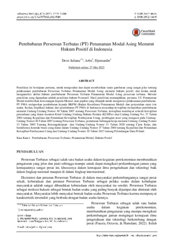 Dewi, Juliana and Arba, Arba and Djumardin, Djumardin (2023) Pembubaran perseroan terbatas (PT) penanaman modal asing menurut hukum positif di Indonesia. Indonesia Berdaya, 4 (3): 48. pp. 1235-1244. ISSN 2721-0669