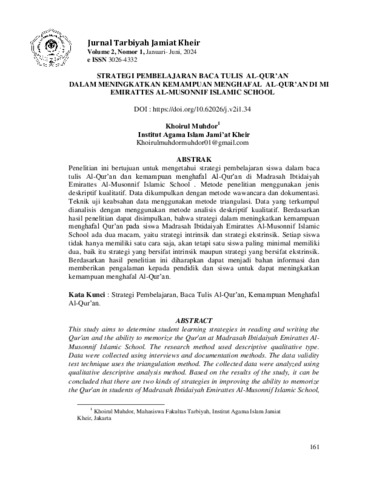 Khoirul, Muhdor (2024) Strategi pembelajaran baca tulis Al-Qur’an dalam meningkatkan kemampuan menghafal Al-Qur’an di MI Emirattes Al-Musonnif Islamic School. Jurnal Tarbiyah Jamiat Kheir, 2 (1): 1. pp. 161-178. ISSN 3026-4332
