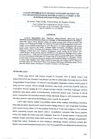 Kajian tentang distribusi polutan dan tingkat cemaran pada sedimen permukaan dan aedimen core di daerah pesisir Banda Aceh akibat tsunami telah dilakukan menggunakan teknik nuklir. Sample sedimen diambil menggunakan alat grab dan gravity core untuk mendapatkan pola sebaran polutan secara horizontal dan vertikal, sedangkan tingkat kontaminasi dibandingkan dengan nilai indeks kualitas sediment Hongkong dan kandungan sedimen dari yang tidak terkena dampak tsunami.