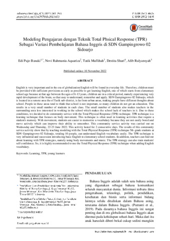 Edi, Pujo Basuki and Novi, Rahmania Aquariza and Tatik, Mufliha and Destita, Shari and Afib, Rulyansyah (2023) Modeling pengajaran dengan teknik Total Physical Response (TPR) sebagai variasi pembelajaran Bahasa Inggris di SDN Gampingrowo 02 Sidoarjo. Indonesia Berdaya, 4 (1): 33. pp. 261-266. ISSN 2721-0669