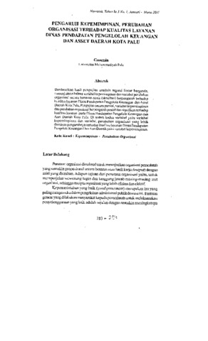 Berdasarkan basil pengujian analisis regresi linear berganda, menunjukkan bahwa variabel kepemimpinan dan variabel perubahan organisasi secara bersama-sama (simultan) berpengaruh terhadap kualitas layanan Dinas Pendapatan Pengelola Keuangan dan Asset Daerah Kota Palu, Pengujian secara parsial, variabel kepemimpinan dan perubahan organisasi berpengaruh positif dan signifikan terhadap kualitas layanan pada Dinas Pendapatan Pengelola Keuangan dan Aset Daerah Kota Palu. Di antara kedua variabel yaitu variabel kepemimpinan dan variabel perubahan organisasi yang lebih dominan pengaruhnya terhadap kualitas layanan Dinas Pendapatan Pengelola Keuangan Dan Aset Daerah yaitu variabel kepemimpinan.
