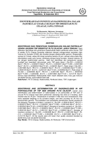 Rusmanto, Tri and Mulyono, Mulyono and Iswantoro, Iswantoro (2012) IDENTIFIKASI DAN PENENTUAN RADIONUKLIDA DALAM PARTIKULAT UDARA UKURAN TSP DISEKITAR PLTU CILACAP, JAWA TENGAH. PROSIDING SEMINAR PENELITIAN DAN PENGELOLAAN PERANGKAT NUKLIR. pp. 204-209.