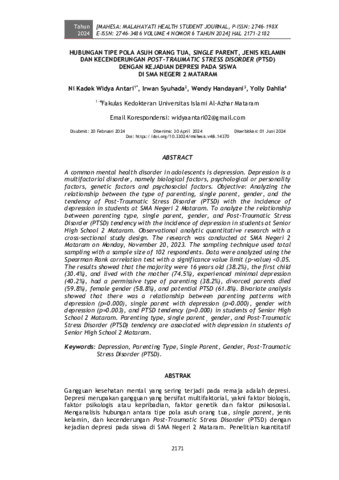 Ni, Kadek Widya Antari and Irwan, Syuhada and Wendy, Handayani and Yolly, Dahlia (2024) Hubungan tipe pola asuh orang tua, single parent, jenis kelamin dan kecenderungan Post-Traumatic Stress Disorder (PTSD) dengan kejadian depresi pada siswa di SMA Negeri 2 Mataram. MAHESA: Malahayati Health Student Journal, 4 (6): 6. pp. 2171-2182. ISSN 2746-198X